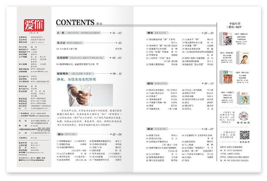 《愛你》“紅版”刊頭為紅色,內容涉及身心健康、養心益壽、文史博覽、婚姻家庭、生活百科、美顏美體等各方面的知識,集故事性、藝術性和趣味性于一體,是“幸福家庭的健康讀本”?!稅勰恪罚ㄐ撵`讀本)“藍版”刊頭為藍色,一直踐行“大健康”的辦刊理念,致力于做“優雅人士的心靈讀本”。