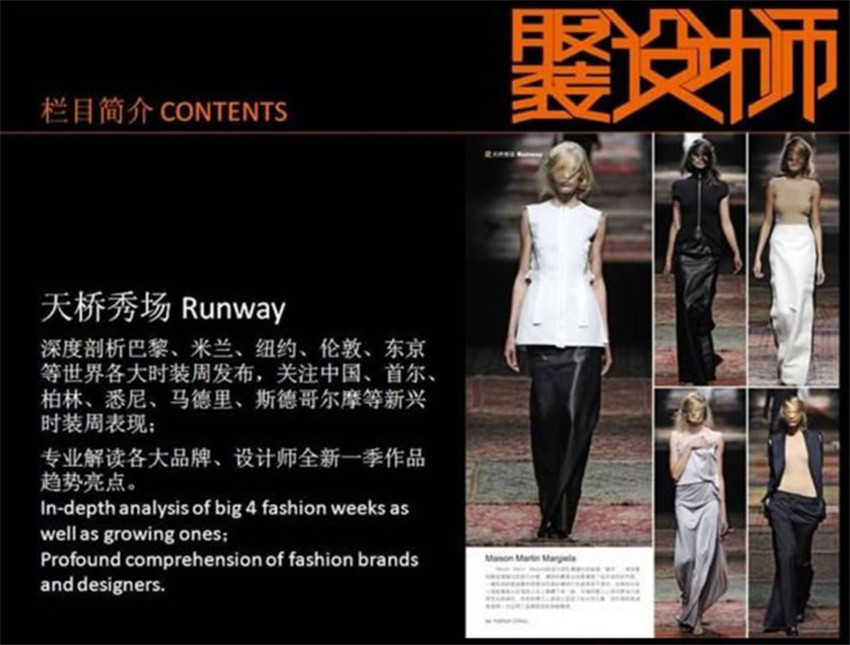 《服裝設(shè)計(jì)師》雜志,(月刊),是面向全國(guó)發(fā)行的時(shí)尚娛樂類期刊,雜志擁有獨(dú)到的思維與敏銳的眼光,使得雜志成為眾多國(guó)際大品牌客戶重視的核心媒體之一。