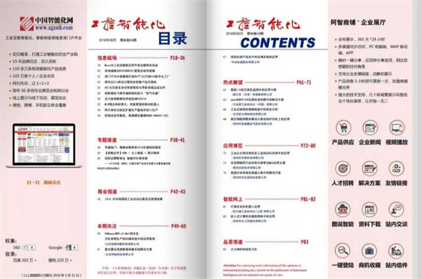 經營策略及完整自動化解決方案,提供用戶多種選擇,協助商家拓展市場。期刊以簡體中文出版,每年發行12期,主要欄目:信息磁場、高管訪談、專題報道、智能化刊中刊、本期關注、應用博覽、熱點瞭望、智能網上、智能化您上、品名悟道,龐大的數據庫篩選不僅使得我們擁有專業的讀者群,也為廣大廠商和讀者提供一座信息的橋梁。