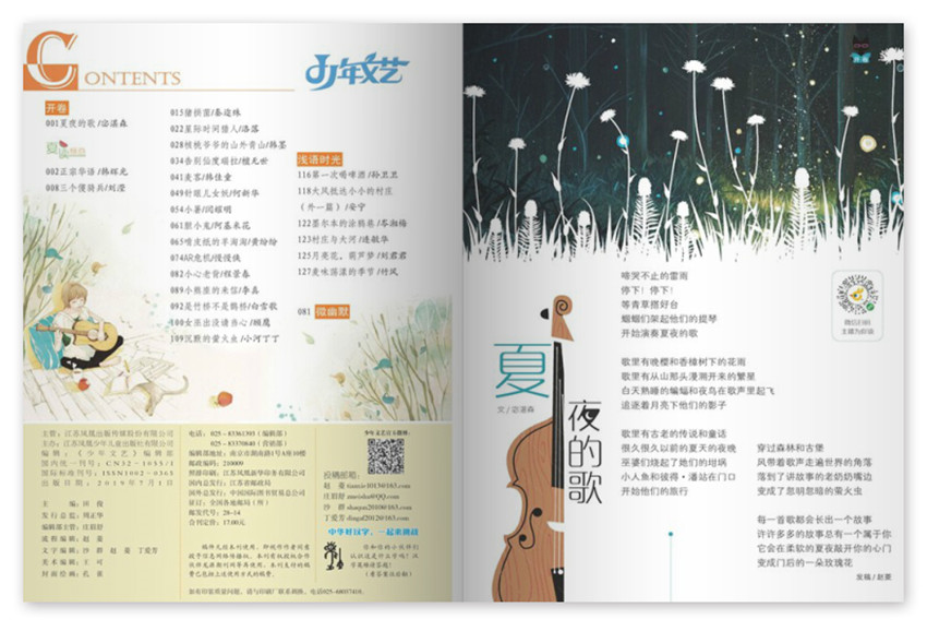 《少年文藝》雜志,(月刊),是面向全國發行的家庭生活類期刊,雜志擁有獨到的思維與敏銳的眼光,使得雜志成為眾多國際大品牌客戶重視的核心媒體之一。未來作家的搖籃,以細膩的筆觸描繪了身邊人的身邊事、身邊景、身邊情,讓孩子們感受這細膩真實的世界并提高孩子寫作能力。