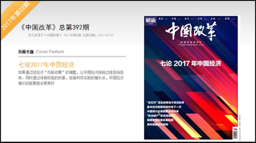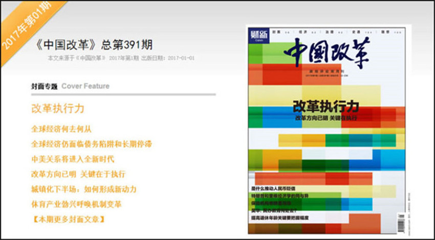 《中國改革》雜志,(雙月刊),是面向全國發行的時政新聞類期刊,雜志擁有獨到的思維與敏銳的眼光,使得雜志成為眾多國際大品牌客戶重視的核心媒體之一。雜志得到國家發改委宏觀經濟研究院、中國經濟體制改革研究會、中央黨校、社科院、北大、人大等科研院校鼎力支持,與其共享優質學術資源,擁有由35名著名專家學者組成的學術委員會和由數百人組成的網絡專家隊伍作為撰稿資源。