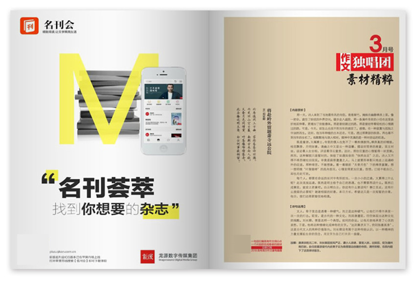《課堂內外·作文獨唱團》雜志,(月刊),是面向全國發行的學習輔導類期刊,雜志擁有獨到的思維與敏銳的眼光,使得雜志成為眾多國際大品牌客戶重視的核心媒體之一。提供當月熱點信息解讀當下社會熱點信息、展現評論和觀點、分析原因和發展進程。“時時速資訊熱話題”等板塊,給中學生帶來新鮮的作文素材。